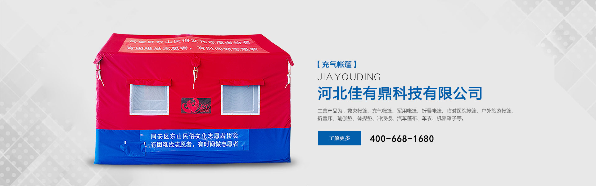 主營產(chǎn)品為:救災(zāi)帳篷、充氣帳篷、軍用帳篷、折疊帳篷、臨時醫(yī)院帳篷、戶外旅游帳篷、折疊床、瑜伽墊、體操墊、沖浪板、汽車篷布、車衣、機器罩子等。